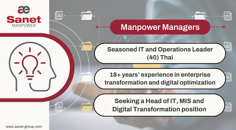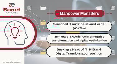 Here, Sanet Manpower, executive headhunter Thailand, regularly introduces Executives with international experience who are looking for a new challenge or for other reasons are seeking the right position with a company in Thailand.